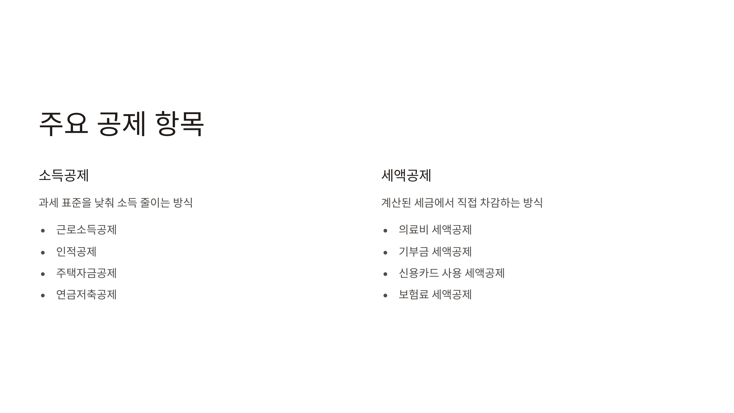 💡 주요 공제 항목: 소득공제 vs. 세액공제