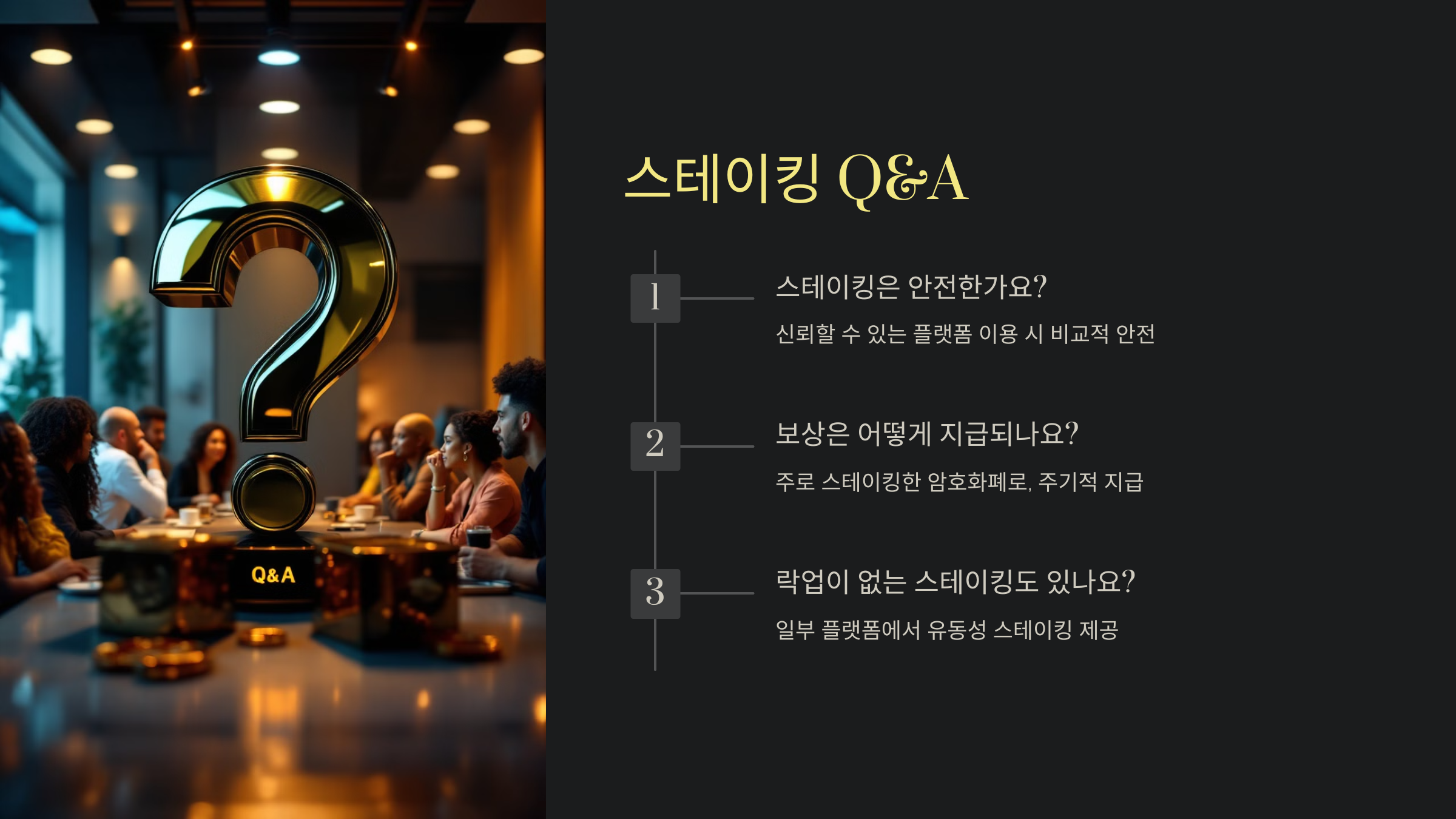 💡 스테이킹은 안전한 수익원이지만, 암호화폐의 기본 리스크는 항상 고려해야 합니다.