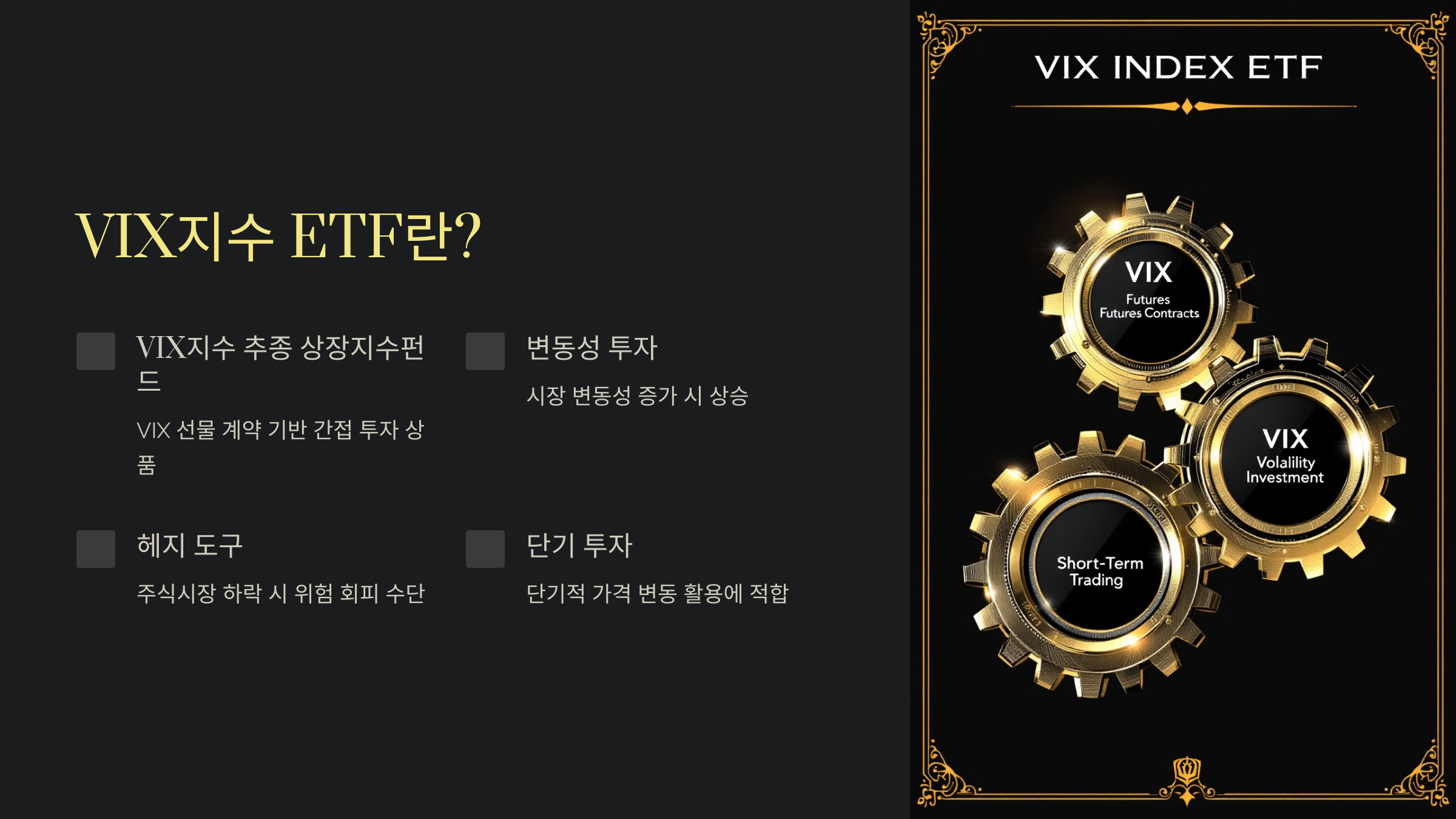 - 변동성 투자: 시장 변동성이 커질 때 상승하는 VIX지수를 기반으로 수익을 추구