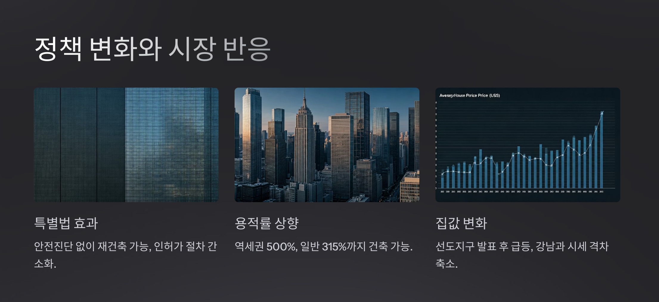- 노후계획도시 특별법: 30년 이상 아파트는 안전진단 없이 재건축 가능, 인허가 절차 대폭 간소화
