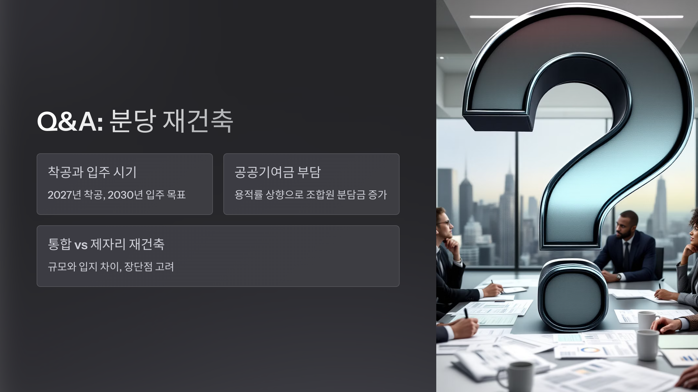 - 사업성·분담금 변수: 공사비, 용적률, 공공기여금 등 조합원 부담이 최대 쟁점