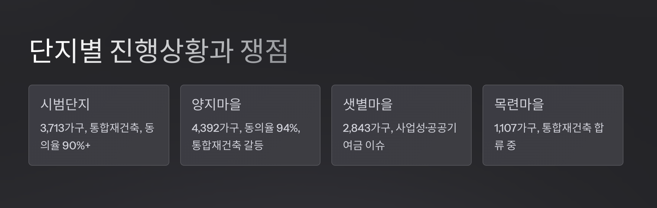 - 양지마을: 4,392가구, 동의율 94% 돌파, 통합 재건축 내 갈등(역세권-비역세권 배치 등)