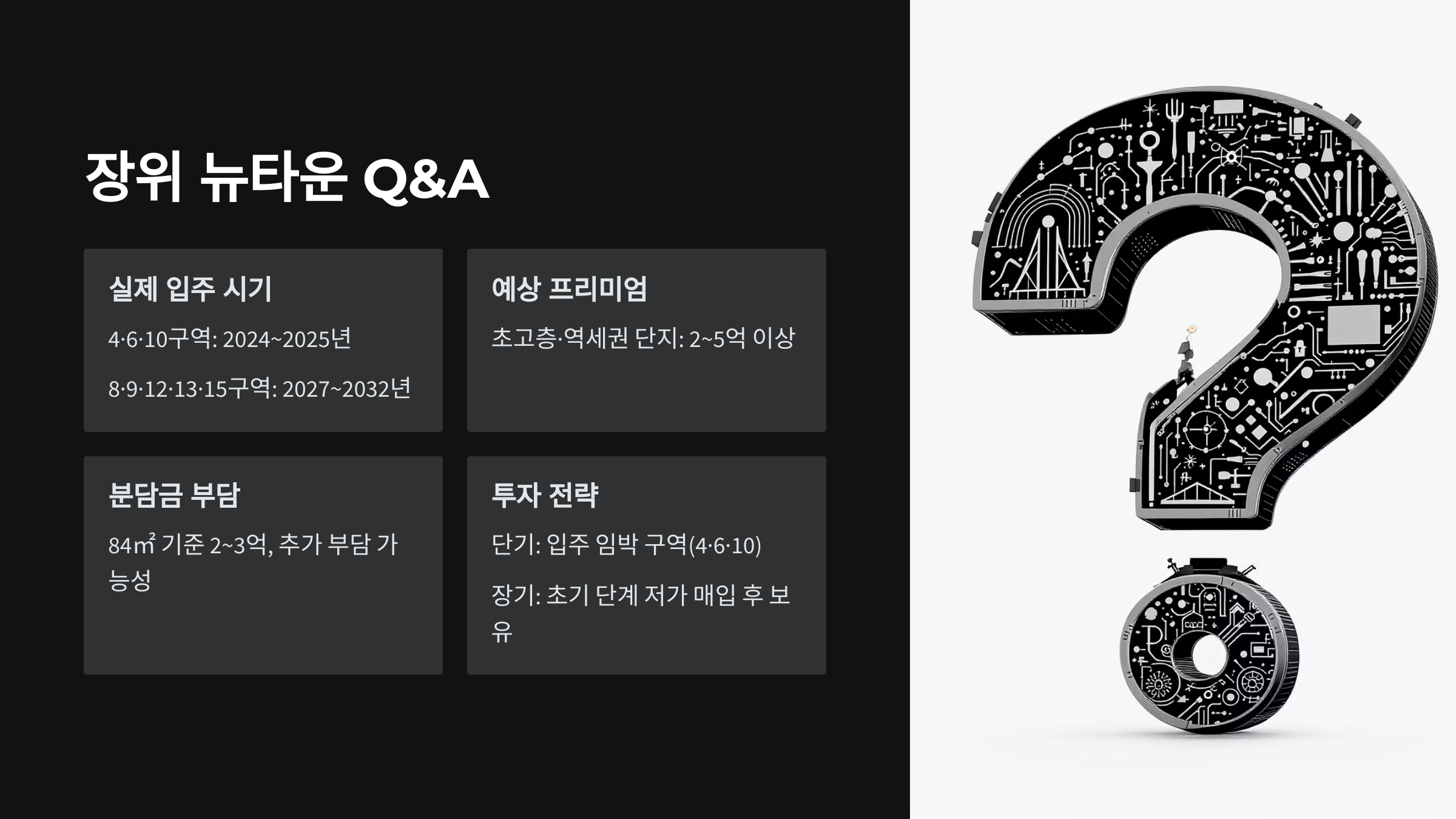 - 단기는 입주 임박 구역(4·6·10), 장기는 초기 단계(8·9·12·13·15) 저가 매입 후 2030년대 입주까지 보유 전략이 유리합니다.