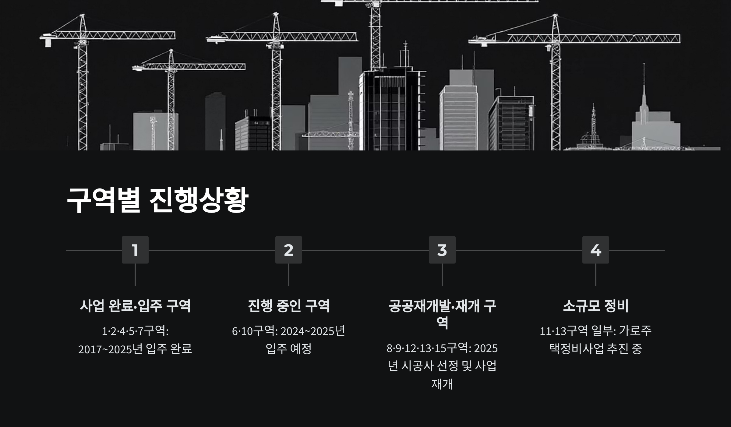 - 동쪽(1·2·4·5·7 구역) 사업 완료, 서쪽(8·9·12·13·15 구역) 재개발 본격화