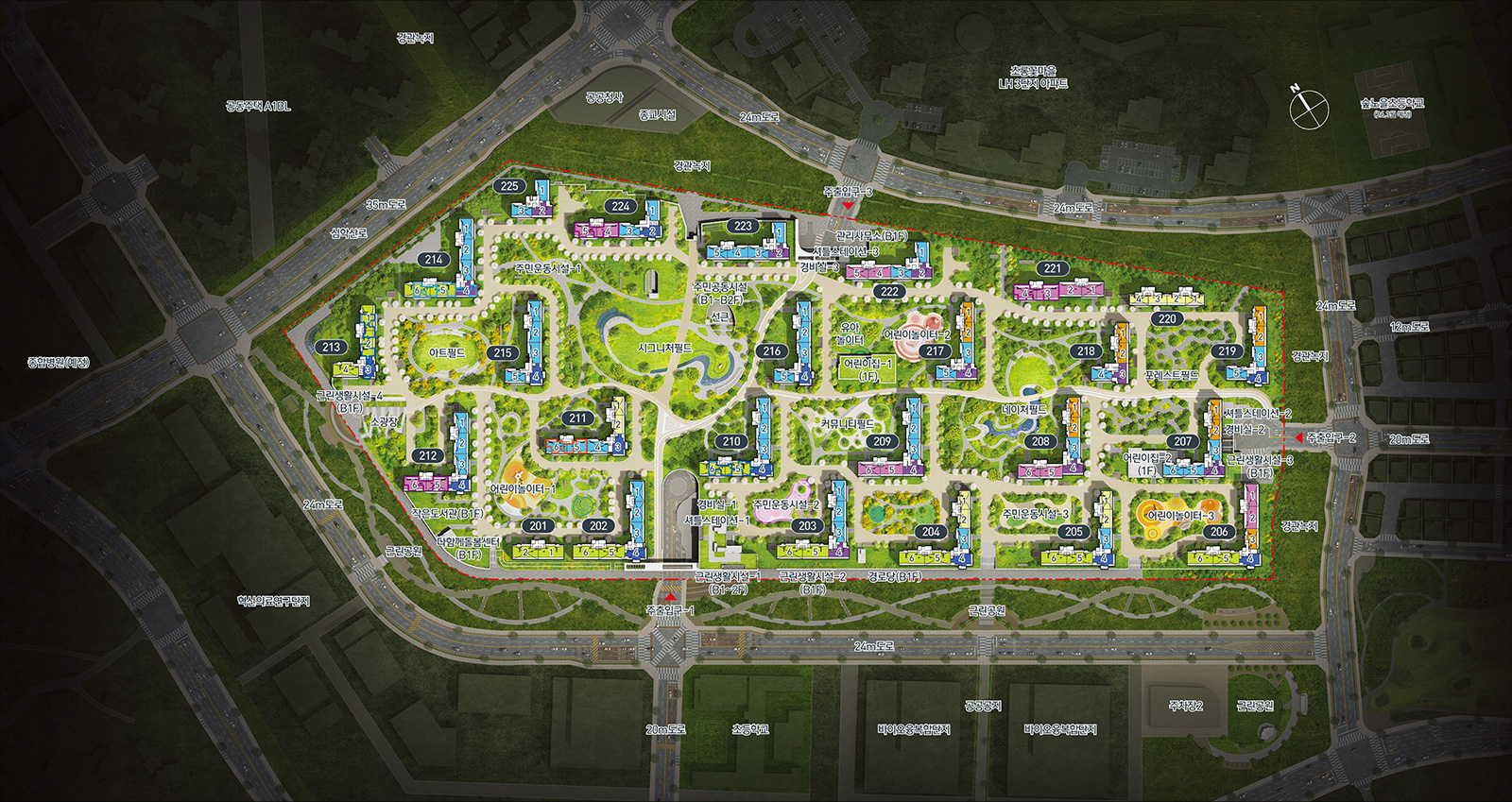 • 2.2km 순환 러닝트랙, 축구장 9배(6.4만m²) 단지 안 공원, 테마정원·커뮤니티필드