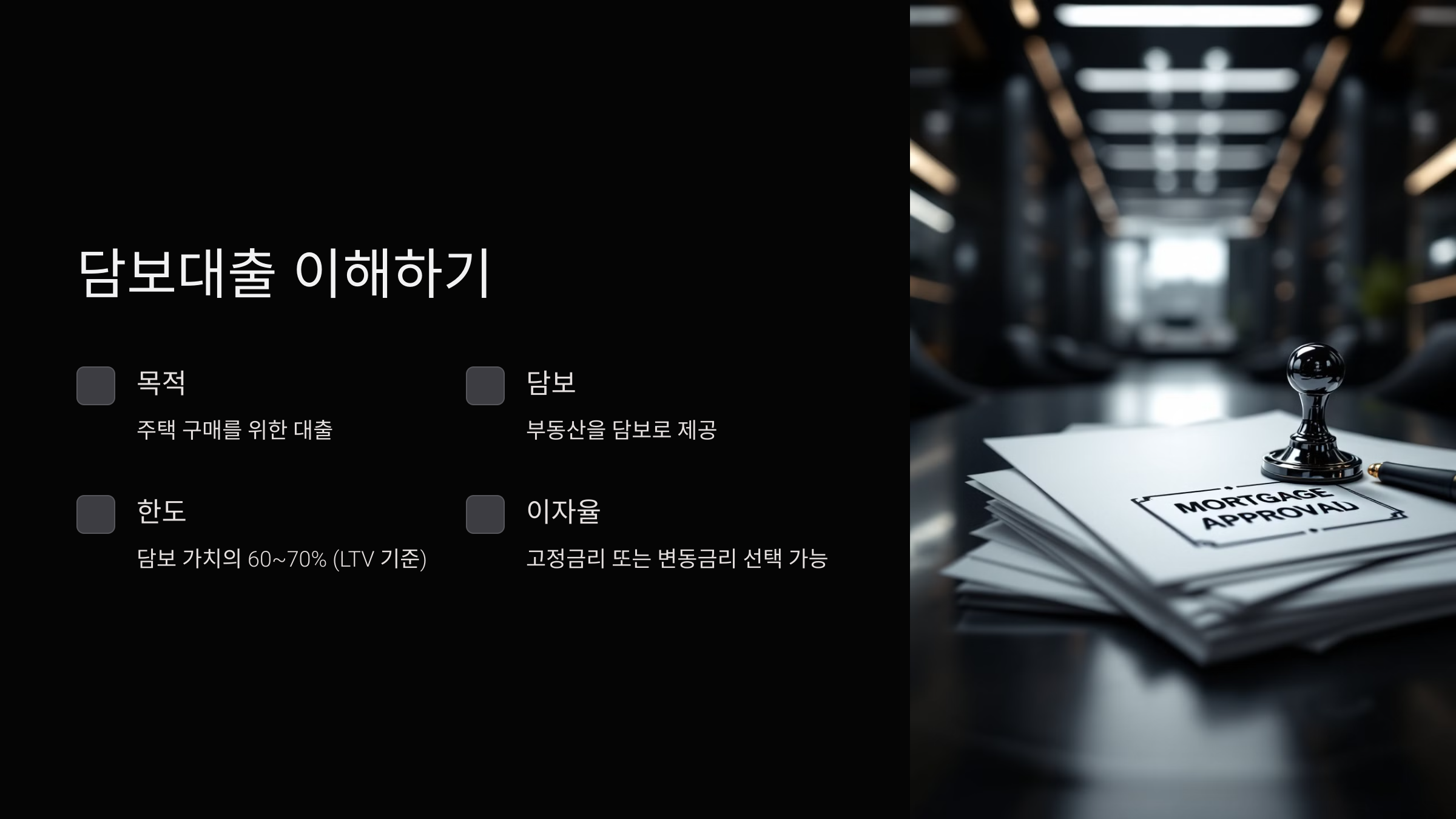 - 대출 한도: 담보 가치의 60~70% (LTV 기준)