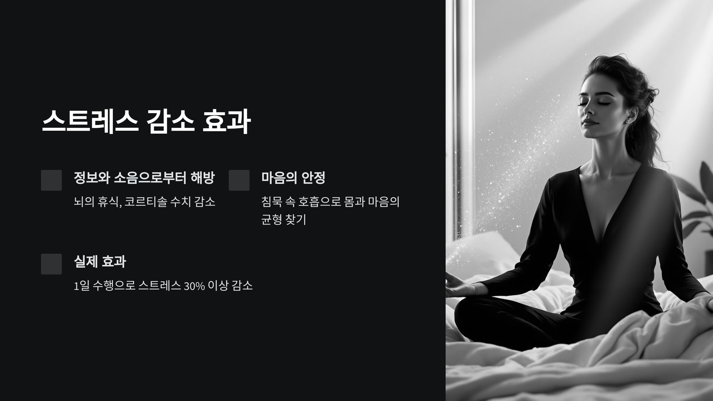 연구에 따르면 1일 묵언수행만으로도 스트레스 수준이 30% 이상 감소하며, 정기적인 수행은 우울감과 불안을 완화시키는 것으로 나타났습니다.