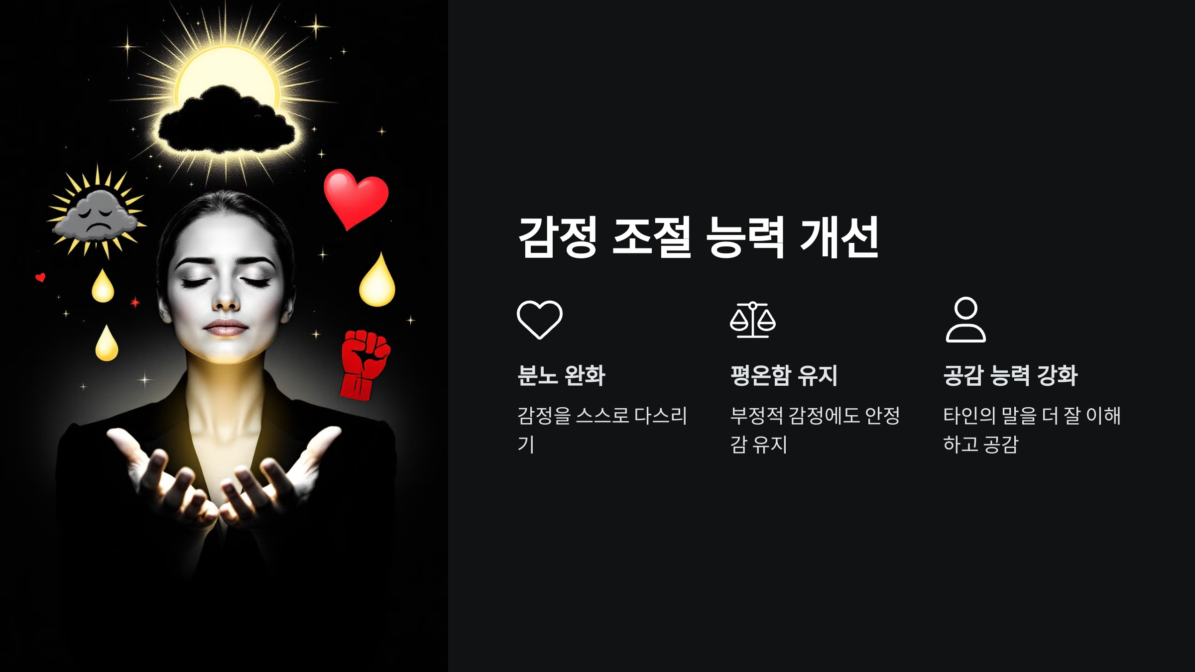 - 자기 이해: 내가 느끼는 감정과 그 원인을 깨닫는 데 도움을 줍니다.