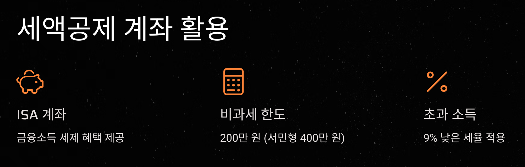 ISA(개인종합자산관리계좌)와 같은 세제 혜택 계좌를 적극 활용하세요. ISA 계좌는 일정 소득 조건을 충족할 경우 금융소득에 대한 세제 혜택을 제공합니다.