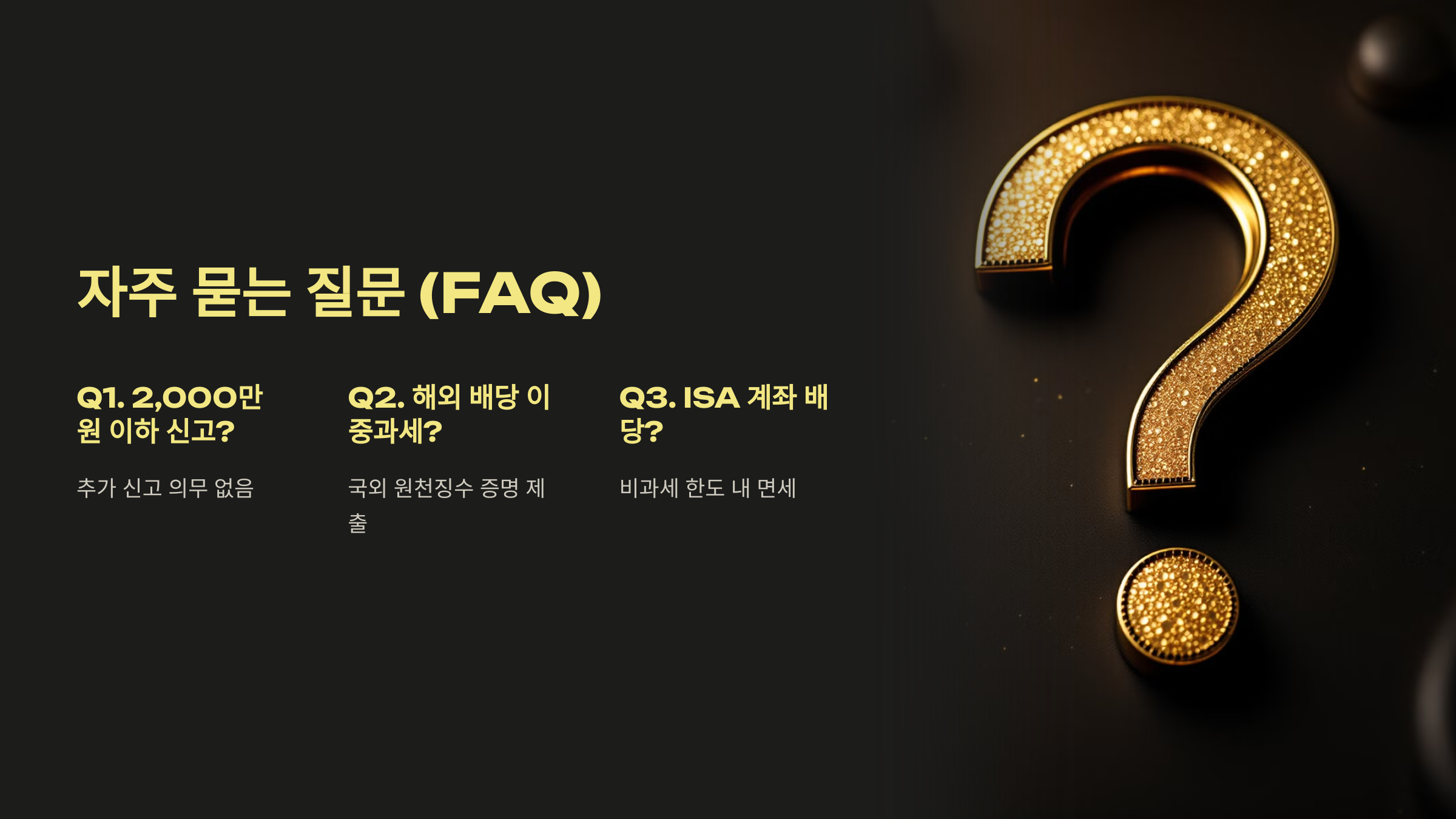 A1. 아닙니다. 2,000만 원 이하인 경우 자동으로 분리과세되므로 추가 신고 의무가 없습니다.