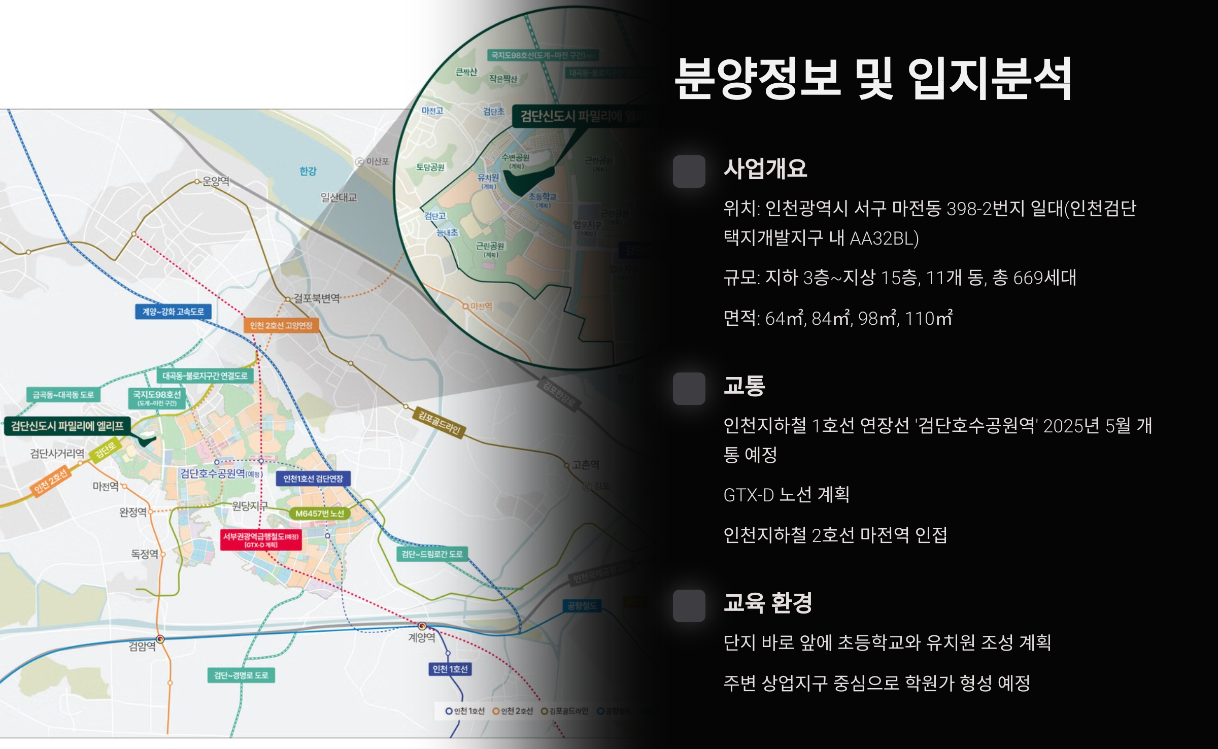 다만, 검단호수공원역과의 거리가 있다는 점은 단기적으로 단점이 될 수 있습니다. 하지만 장기적인 관점에서 검단신도시의 발전 가능성을 고려하면, 검단신도시 파밀리에 엘리프는 투자와 실거주 모두에 적합한 선택이 될 것입니다.