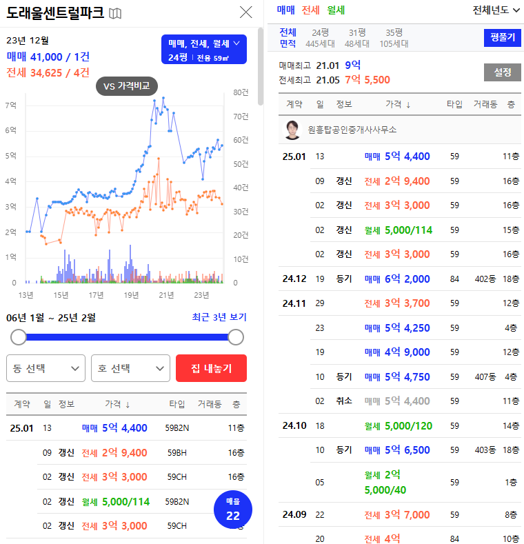 | 59㎡ | 5.2억 | 5.5~6.5억 도레울센트럴파크 | 3,000만 원 ↑ |