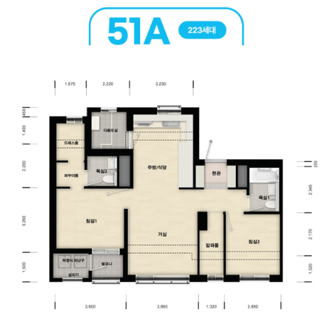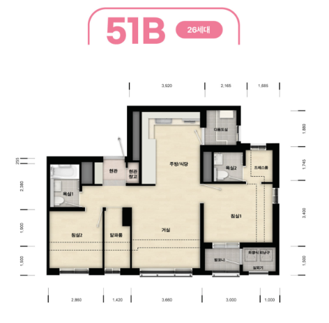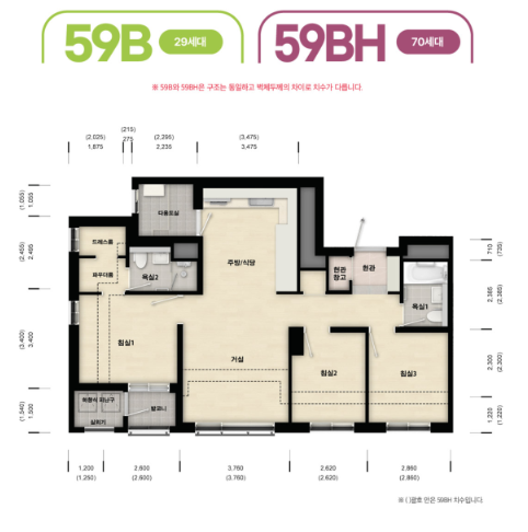 - 59㎡(4 베이): 3룸 구성, 드레스룸 등 최적의 평면