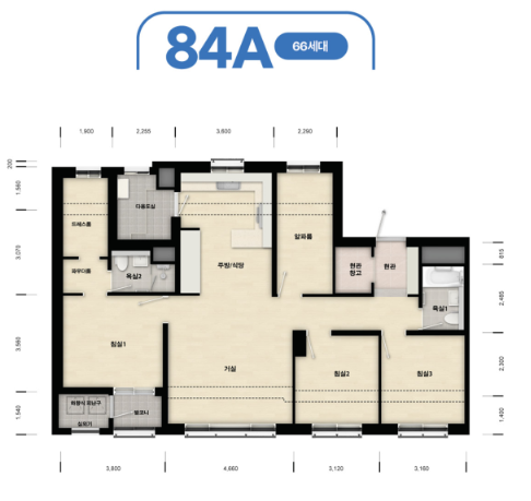 - 84㎡(4 베이): 3룸+알파룸 구성, 맞통풍 구조, 넓은 드레스룸