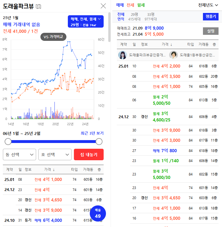 | 74㎡ | 7.1억 | 6.5~7.5억 도래울파크뷰 | 0만 원 ↑ |