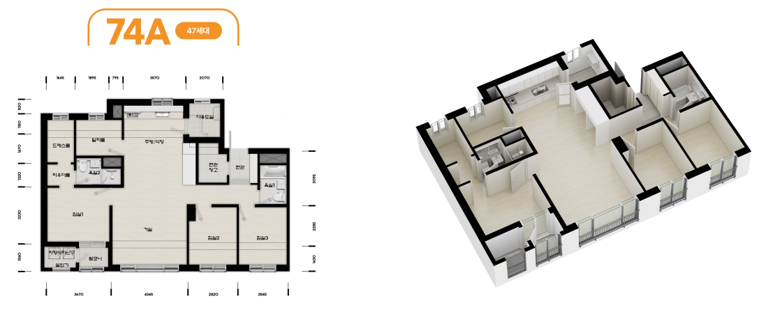 - 74㎡(4 베이): 맞통풍 구조로 알파룸+드레스룸