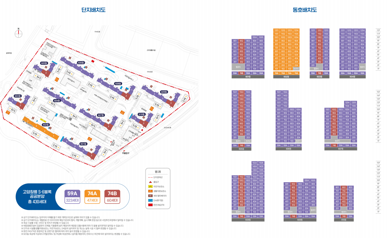 총 430세대의 초고층 주상복합(8~15층)으로 2개 평형(59·74㎡)을 제공합니다.