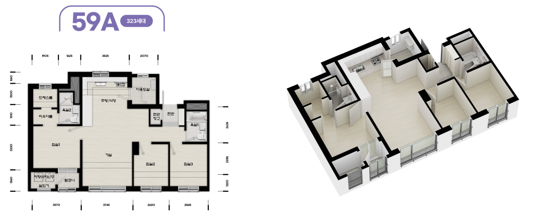 - 59㎡(4베이): 맞통풍 구조로 59 타입 최강 평면