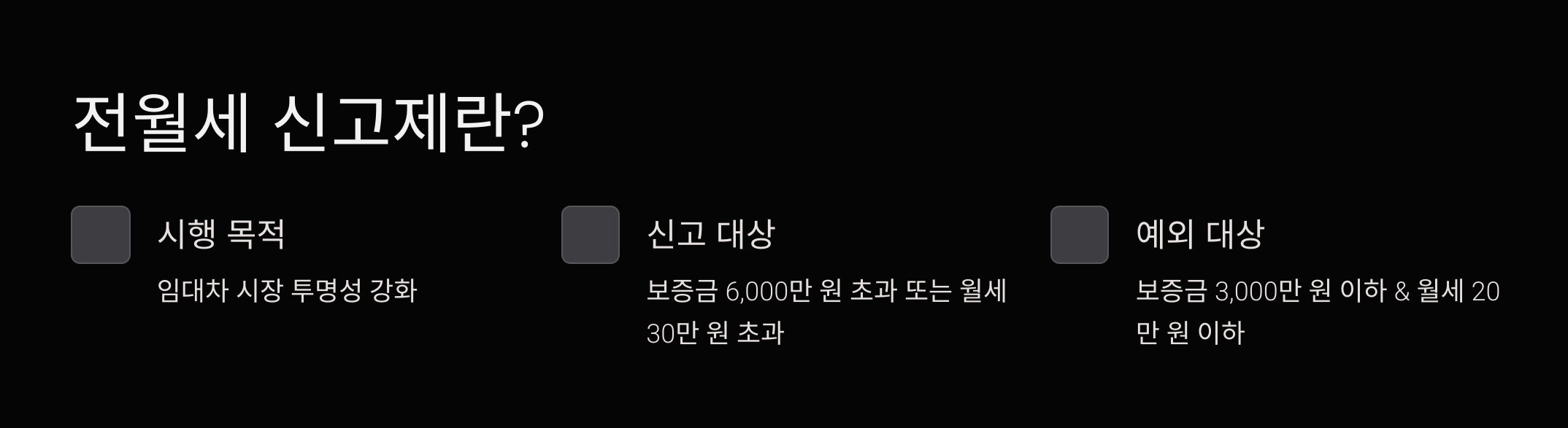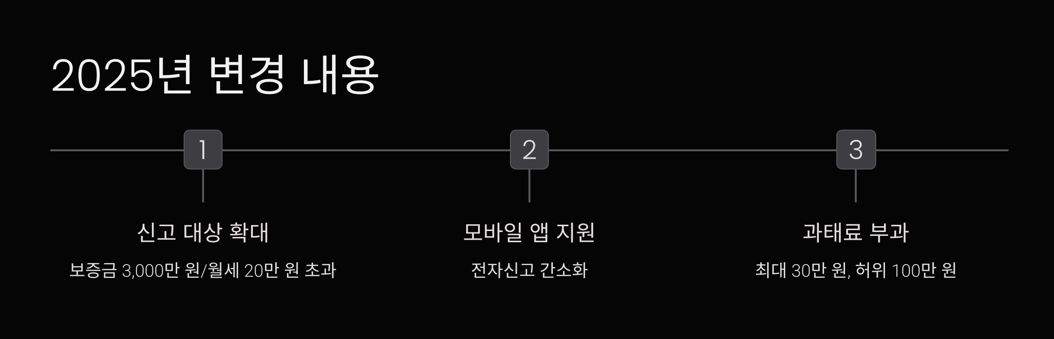 | 신고 대상 금액 | 보증금 6,000만 원/월세 30만 원 초과 | 보증금 3,000만 원/월세 20만 원 초과로 확대 |