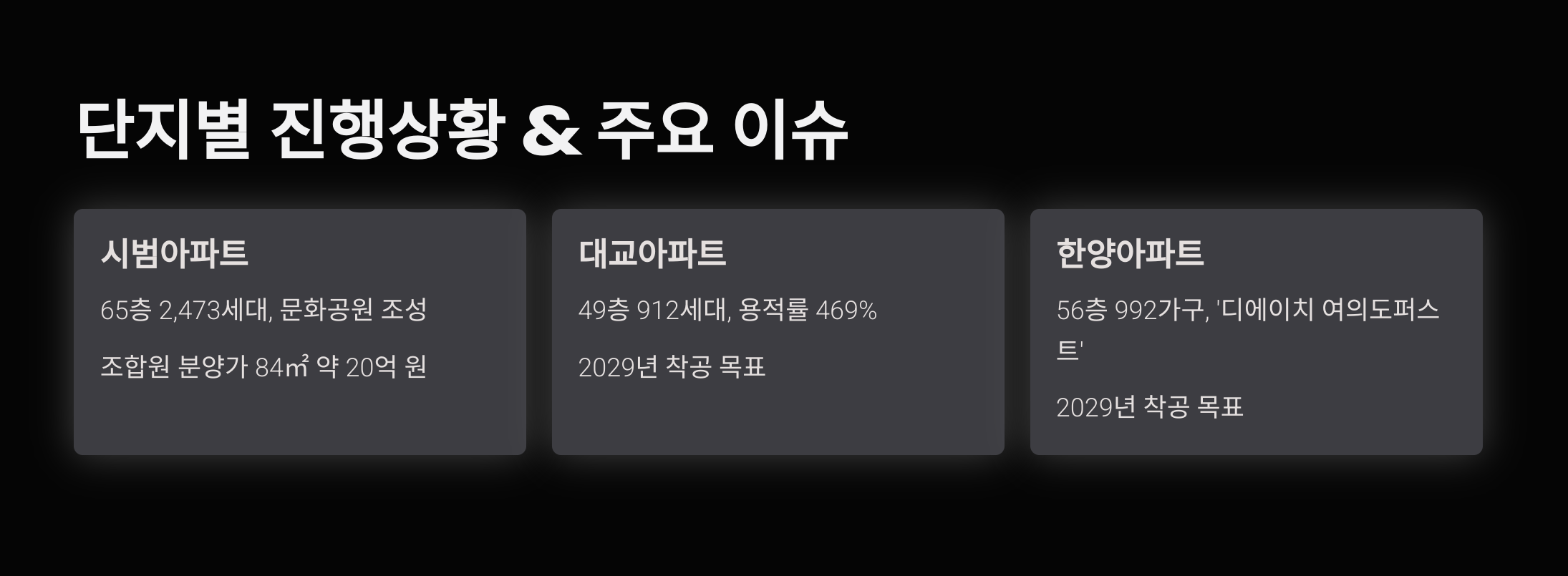 - 한양아파트: 신속통합기획으로 통합심의 통과, 시공사 선정 완료. 기존 588가구→최고 56층 992가구, 하이엔드 브랜드(디에이치 여의도퍼스트) 적용, 2025년 사업시행인가 목표.