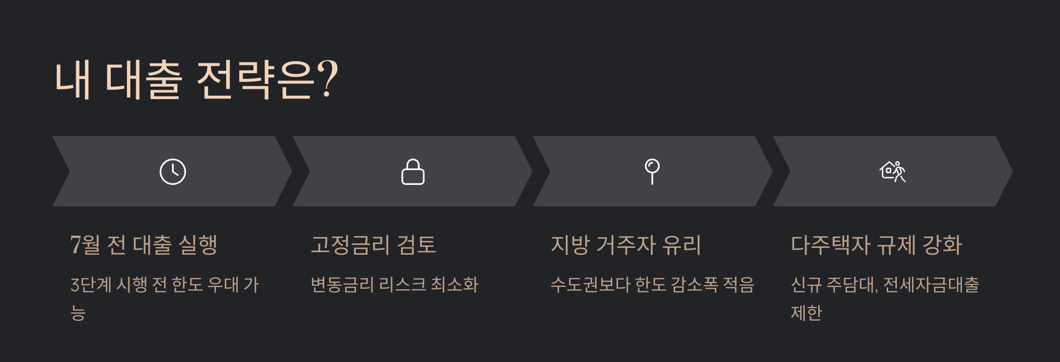 - 대출 계획 있다면 7월 전 실행: 3단계 시행 전 대출 실행 시 한도 우대 가능