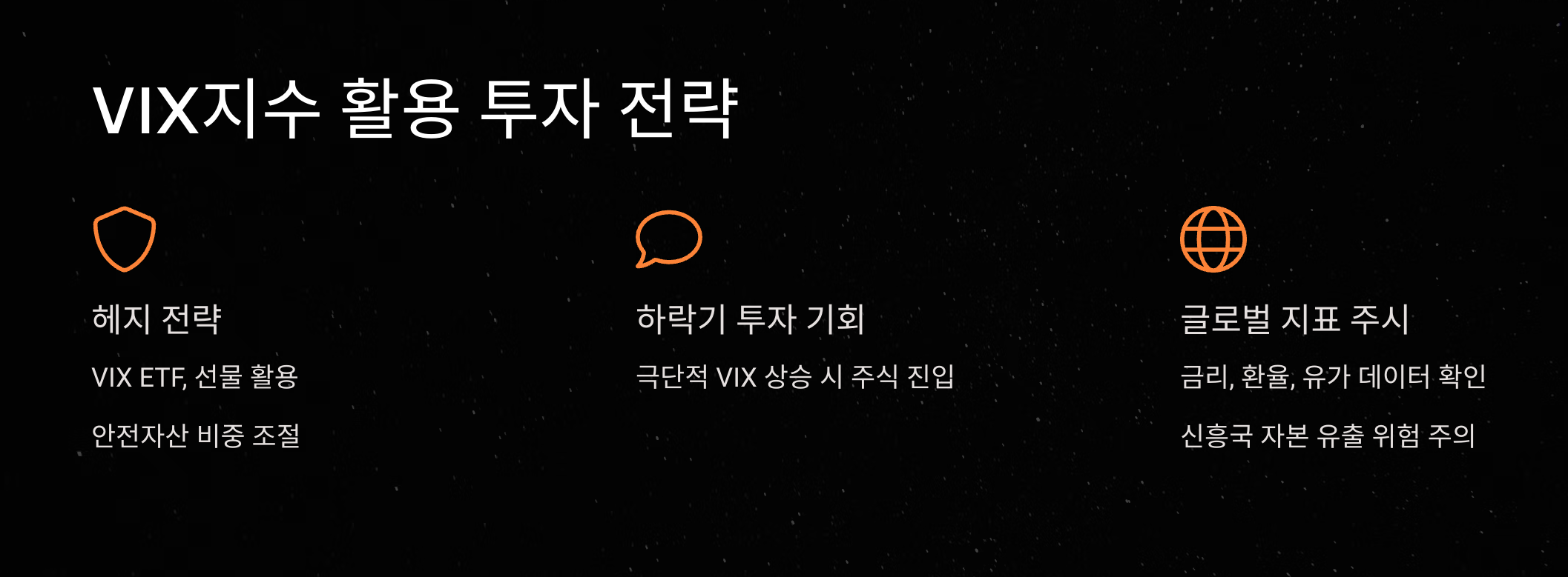 - VIX지수 상승이 예상될 때, VIX ETF나 선물을 활용하여 변동성에 대비합니다.