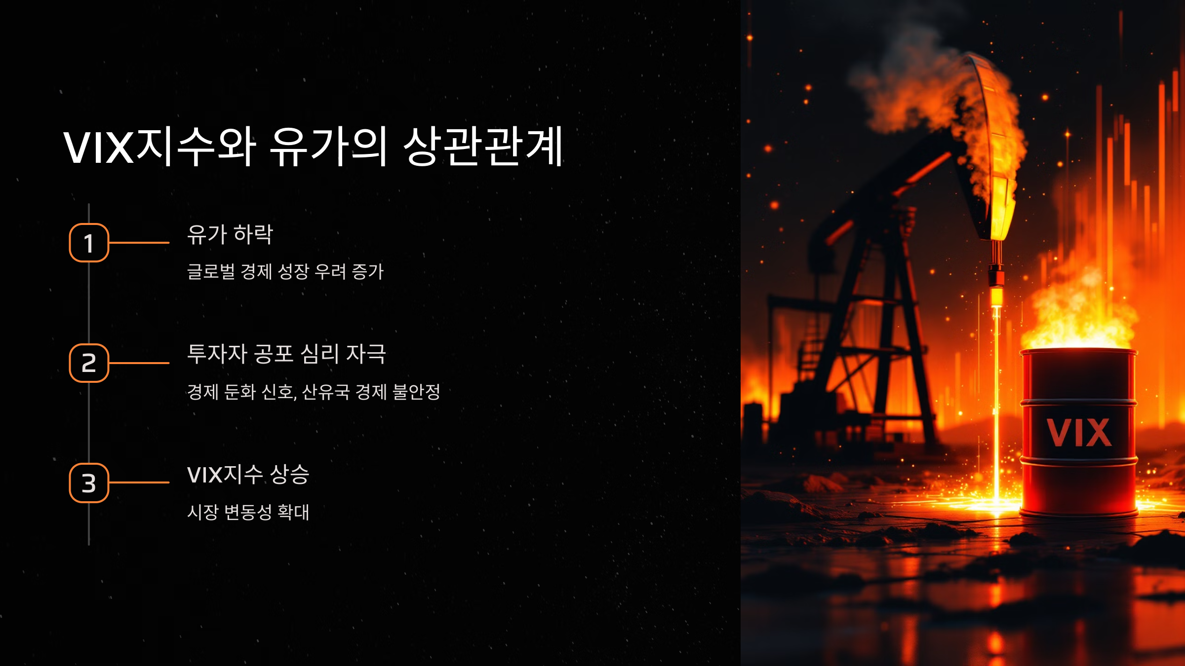| 유가 하락 | VIX지수 상승 (경제 둔화 우려 → 시장 불안 심화) |