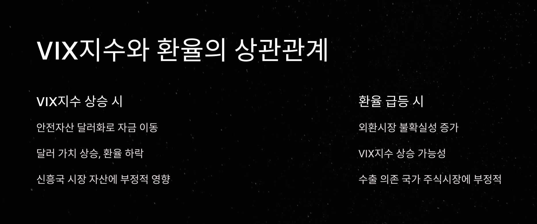 | 환율 상승 | VIX지수 상승 (환율 변동성 → 위험 자산 회피 심리 강화) |