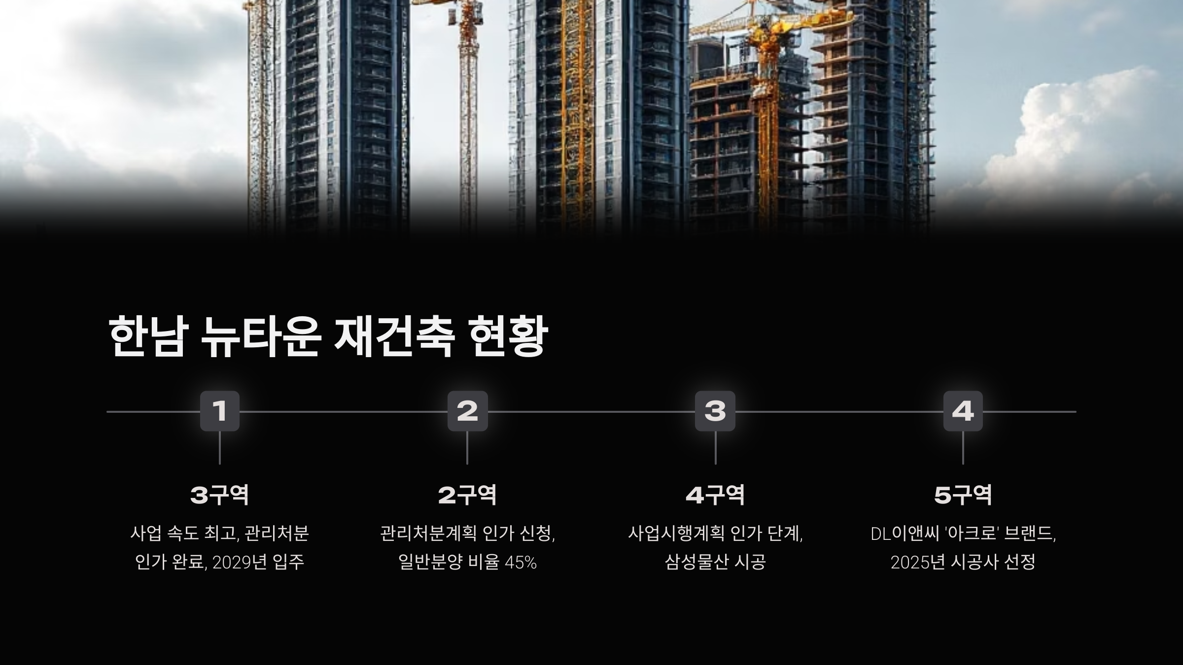 - 2 구역: 관리처분계획 인가 신청, 2025년 상반기 승인 예상(1,500 가구 내외, 일반분양 비율 45%로 사업성 우수)