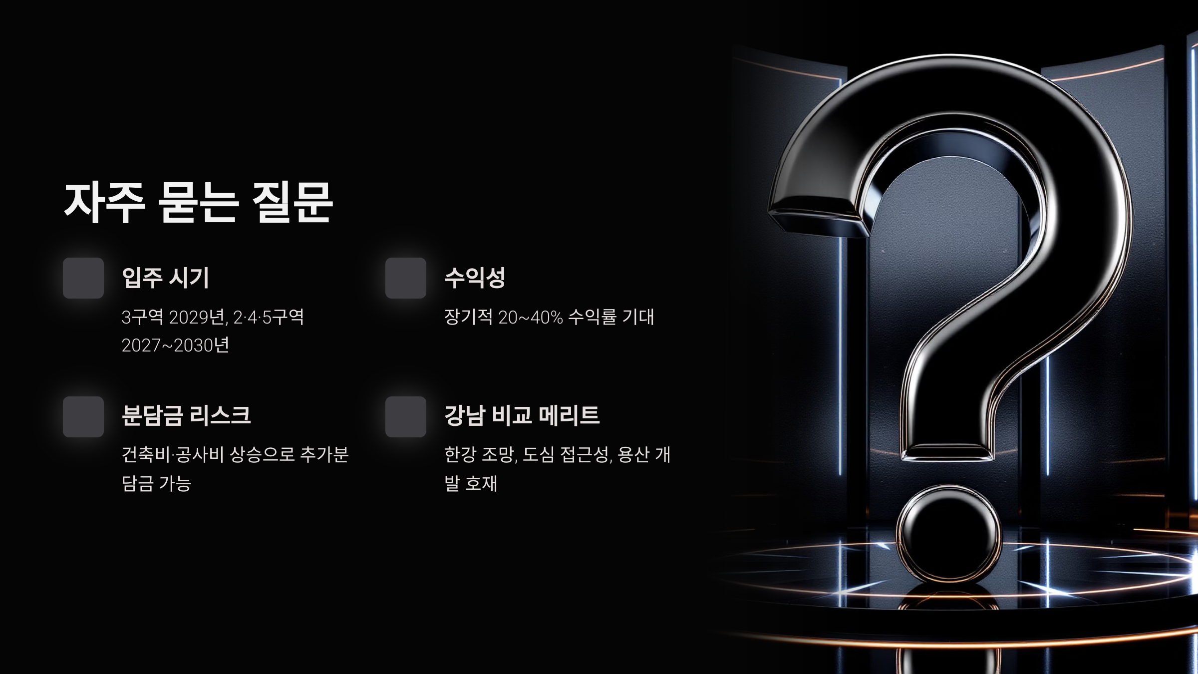 - 매입가와 분담금이 높지만, 입주 후 시세는 인근 최고가 단지와 비슷하게 형성될 전망. 장기적으로 20~40% 수익률 기대 가능합니다.