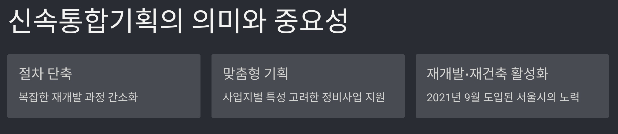신속통합기획은 복잡한 재개발 절차를 단축하고 사업지별 맞춤형 기획으로 정비사업을 지원하는 정책입니다. 2021년 9월에 도입된 이 정책은 재개발·재건축을 활성화하기 위한 서울시의 노력의 일환입니다.