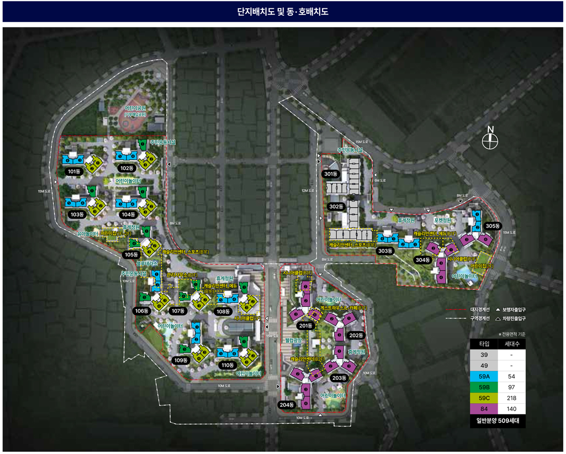 - 단지 중앙에 위치한 84 타입 201동~204동은 조용하고 커뮤니티 시설 이용이 편리할 것으로 예상됩니다.