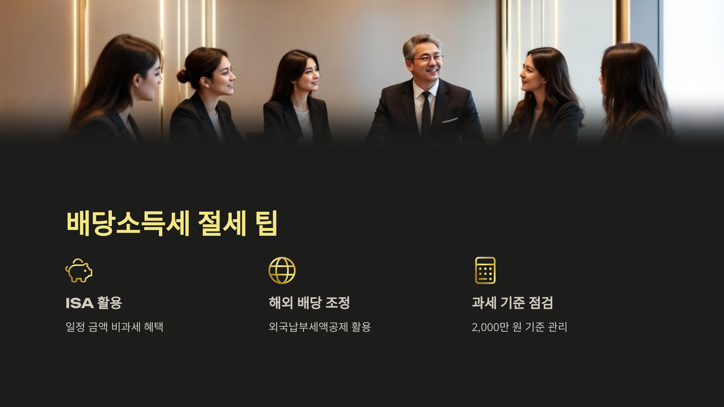 연간 배당소득이 2,000만 원에 근접한다면, 일부 배당을 조정하거나 절세 계좌를 활용해 분리과세를 유지하는 것이 유리할 수 있습니다.