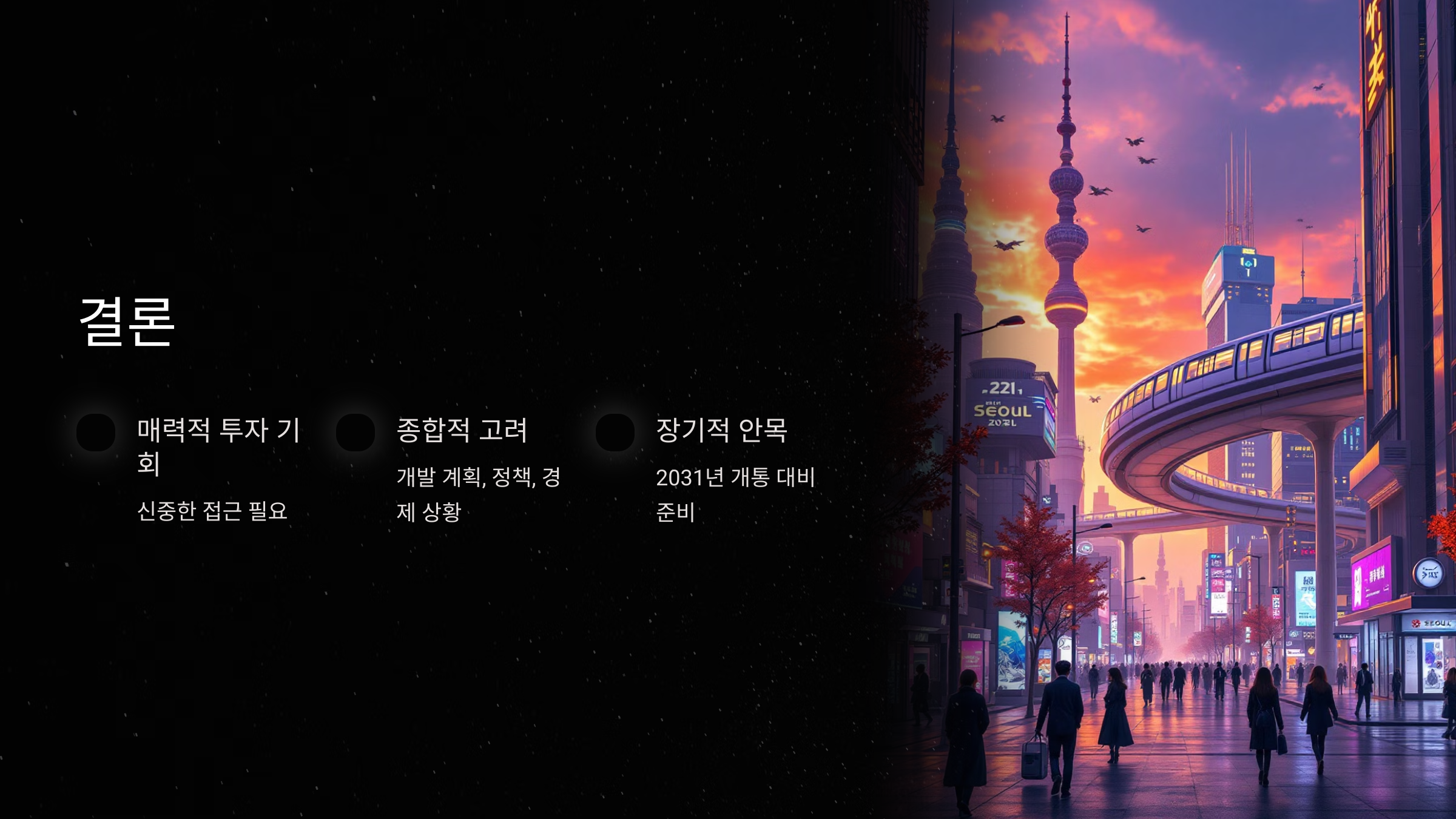 - 장기적 관점 유지: 개통까지 7년, 그 이후의 발전 가능성까지 고려해야 합니다.