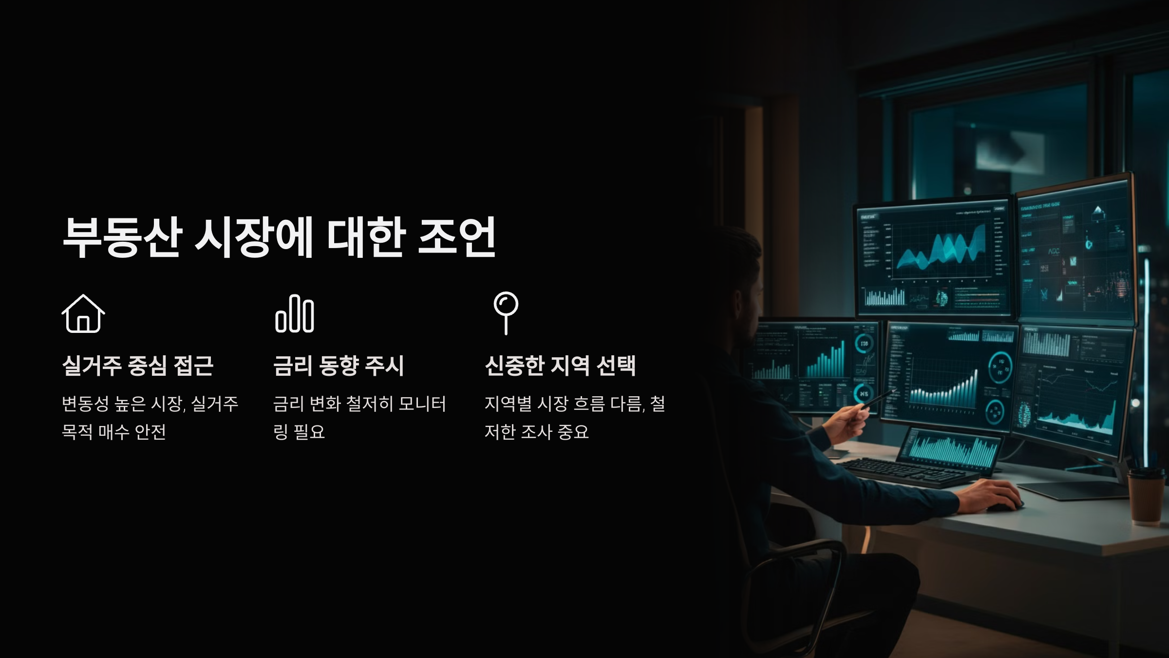2025년 부동산 시장은 여전히 변동성이 높을 가능성이 있습니다. 실거주 목적의 매수는 상대적으로 안전한 선택이 될 수 있습니다.