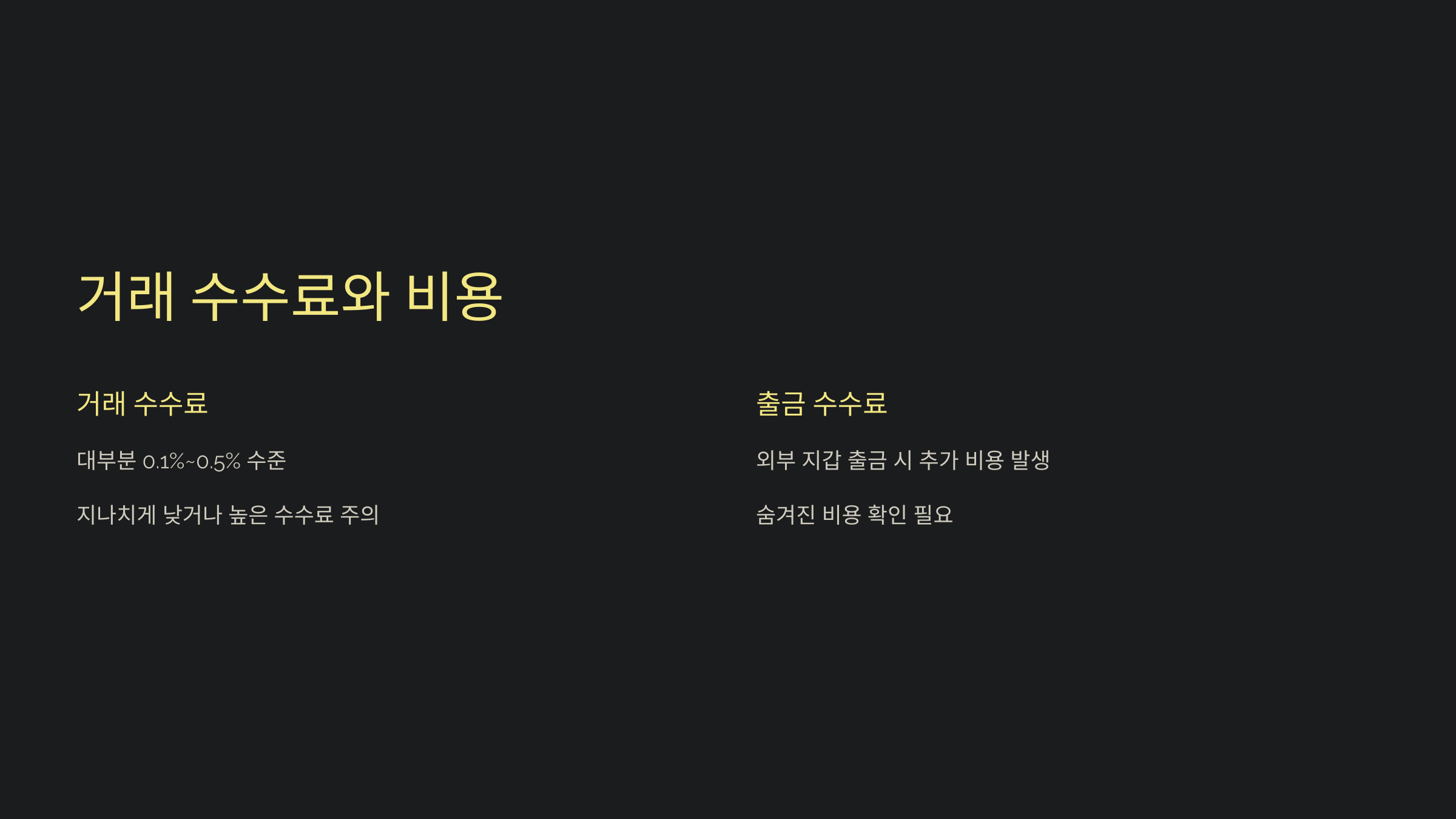 거래소마다 매수/매도 수수료, 입출금 수수료가 다르기 때문에 수수료 구조를 꼼꼼히 비교하세요.