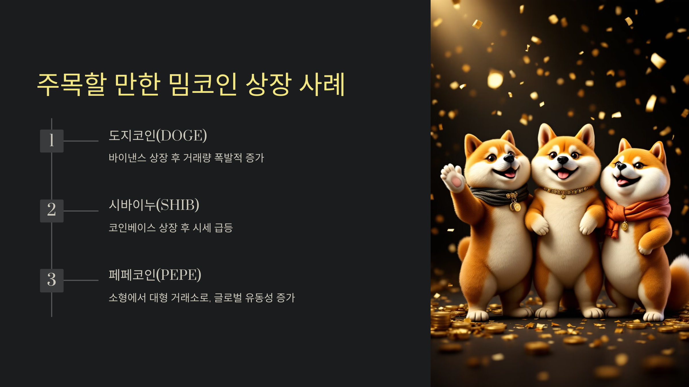 밈코인 상장은 가격 급등의 기회를 제공할 뿐만 아니라, 프로젝트의 신뢰도와 접근성을 높이는 중요한 이벤트입니다.