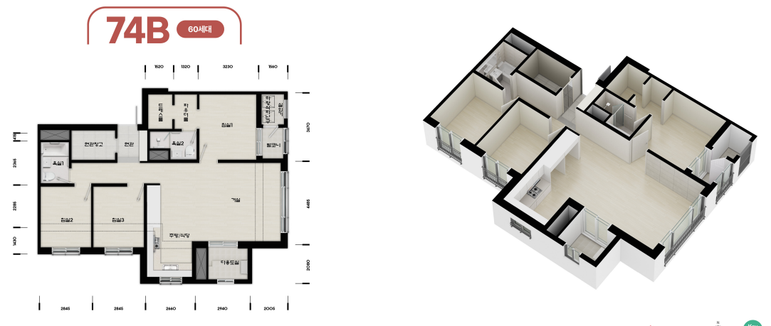 - 74㎡(4 베이): 맞통풍 구조로 알파룸+드레스룸