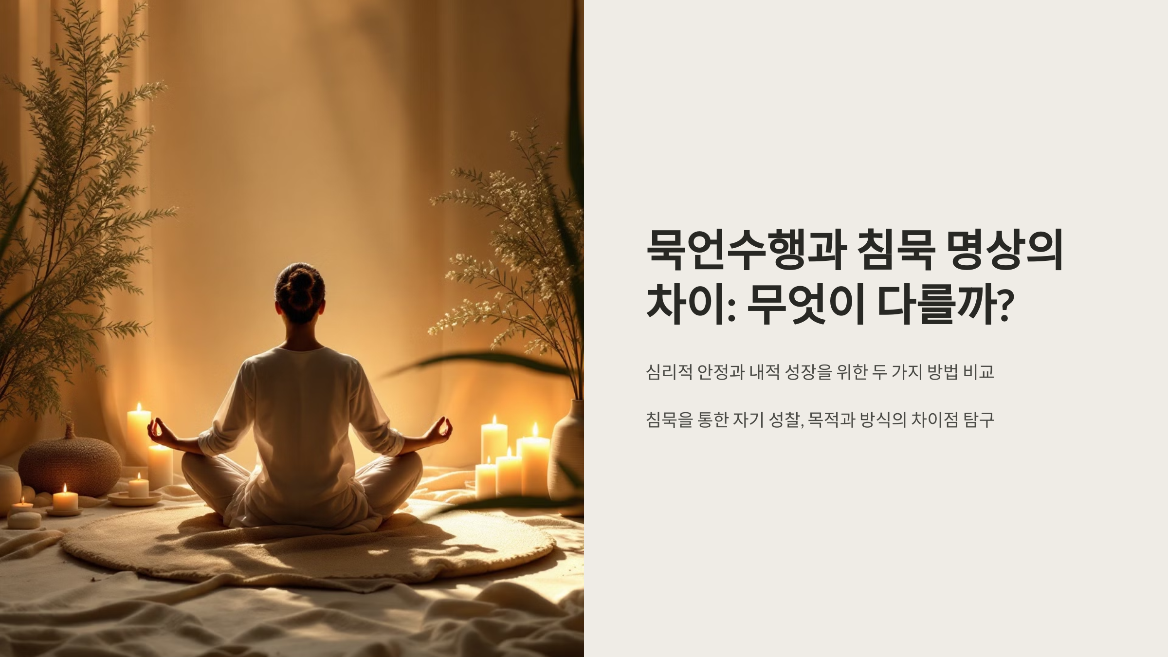 묵언수행과 침묵 명상의 차이: 무엇이 다를까? 🤔서론: 왜 묵언수행과 침묵 명상인가요? 🌿요즘 많은 사람들이 심리적 안정과 내적 성장을 위해 명상과 수행을 찾습니다. 그중에서도 묵언수행과 침묵 명상은 비슷하면서도 다른 개념으로 자주 언급되는데요. 둘 다 '침묵'을 통해 자신을 바라보는 과정이지만, 그 방법과 목적은 꽤 다릅니다. 오늘은 이 두 가지의 차이를 구체적으로 알아보고, 어떤 방식이 나에게 더 적합할지 판단할 수 있는 기준을 제공해 드릴게요! 😊본론: 묵언수행과 침묵 명상의 차이를 알아보자 🔍1. 묵언수행: 불교적 기반에서 시작된 자기 성찰 🙏묵언수행은 불교에서 기원한 수행법으로, 말과 언어를 끊고 침묵 속에서 내면을 돌아보는 방식입니다. 주로 사찰이나 수행원에서 진행되며, 스스로를 관찰..