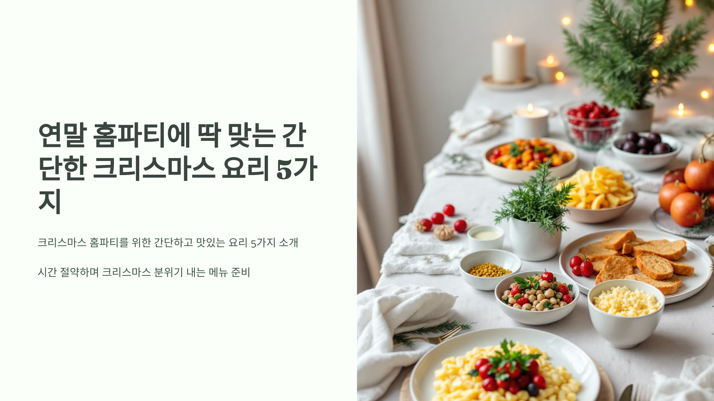 연말 홈파티에 딱 맞는 간단한 크리스마스 요리 5가지연말이 다가오면 가족과 친구들과 함께 즐기는 홈파티가 빠질 수 없습니다. 🎄 하지만 요리에 너무 많은 시간을 투자하기보다는 간단하면서도 크리스마스 분위기를 살릴 수 있는 메뉴를 준비하는 것이 중요합니다. 오늘은 크리스마스 홈파티에 어울리는 간단하고 맛있는 요리 5가지를 소개합니다.🍕 1. 크리스마스 리스 피자요리 시간: 약 30분난이도: ★☆☆☆☆재료:피자 도우토마토소스모차렐라 치즈페퍼로니파프리카(빨강, 초록)바질 잎만드는 법:피자 도우를 링 모양으로 만듭니다.도우 위에 토마토소스를 얇게 바릅니다.모차렐라 치즈를 골고루 뿌린 후, 페퍼로니와 파프리카를 리스 모양으로 배치합니다.180도로 예열한 오븐에서 15분간 굽습니다.바질 잎을 올려 장식하면 완성..